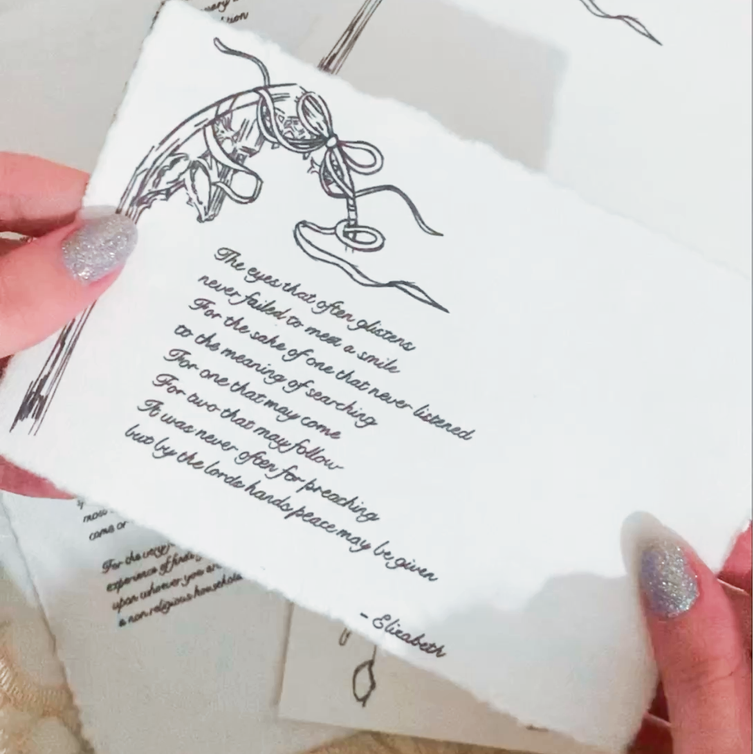Every month you will receive a special envelope filled with an original poem and art border peice, a blank art border peice to fill the paper with your own words and a letter from the creater of what inspired the work.
